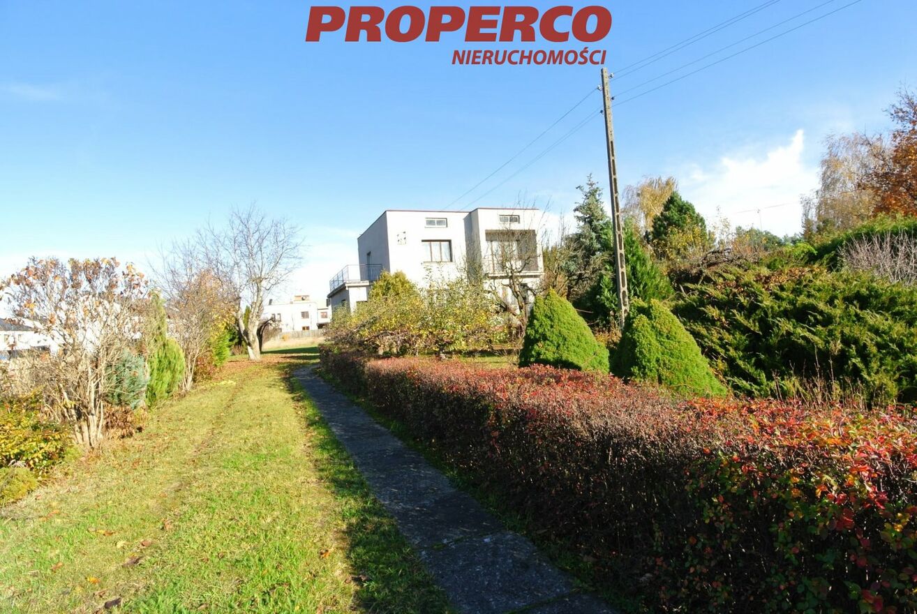 Zadbany ogród, z licznymi nasadzeniami. Na terenie posesji znajduje się dom i garaż.
